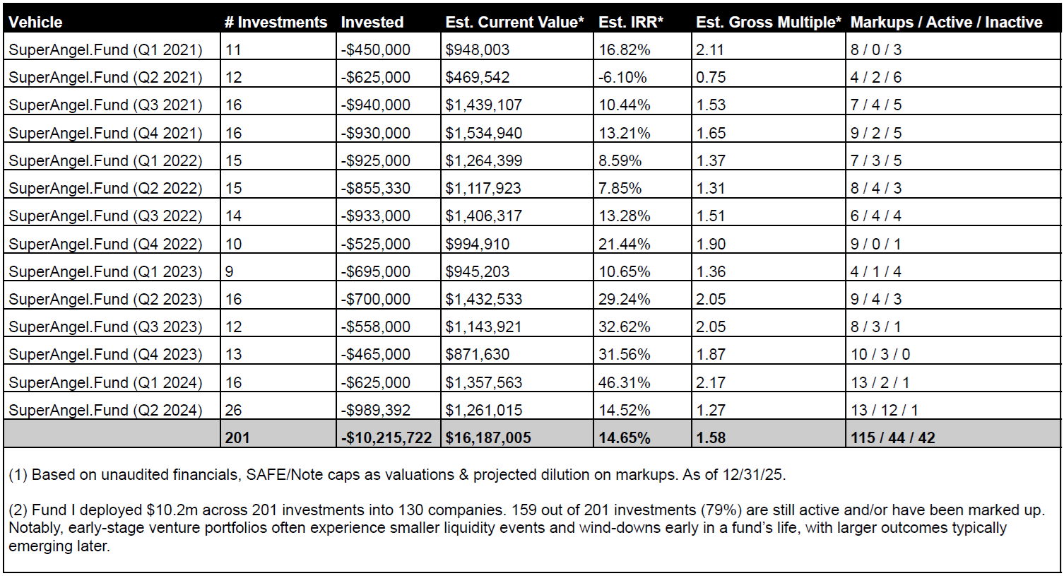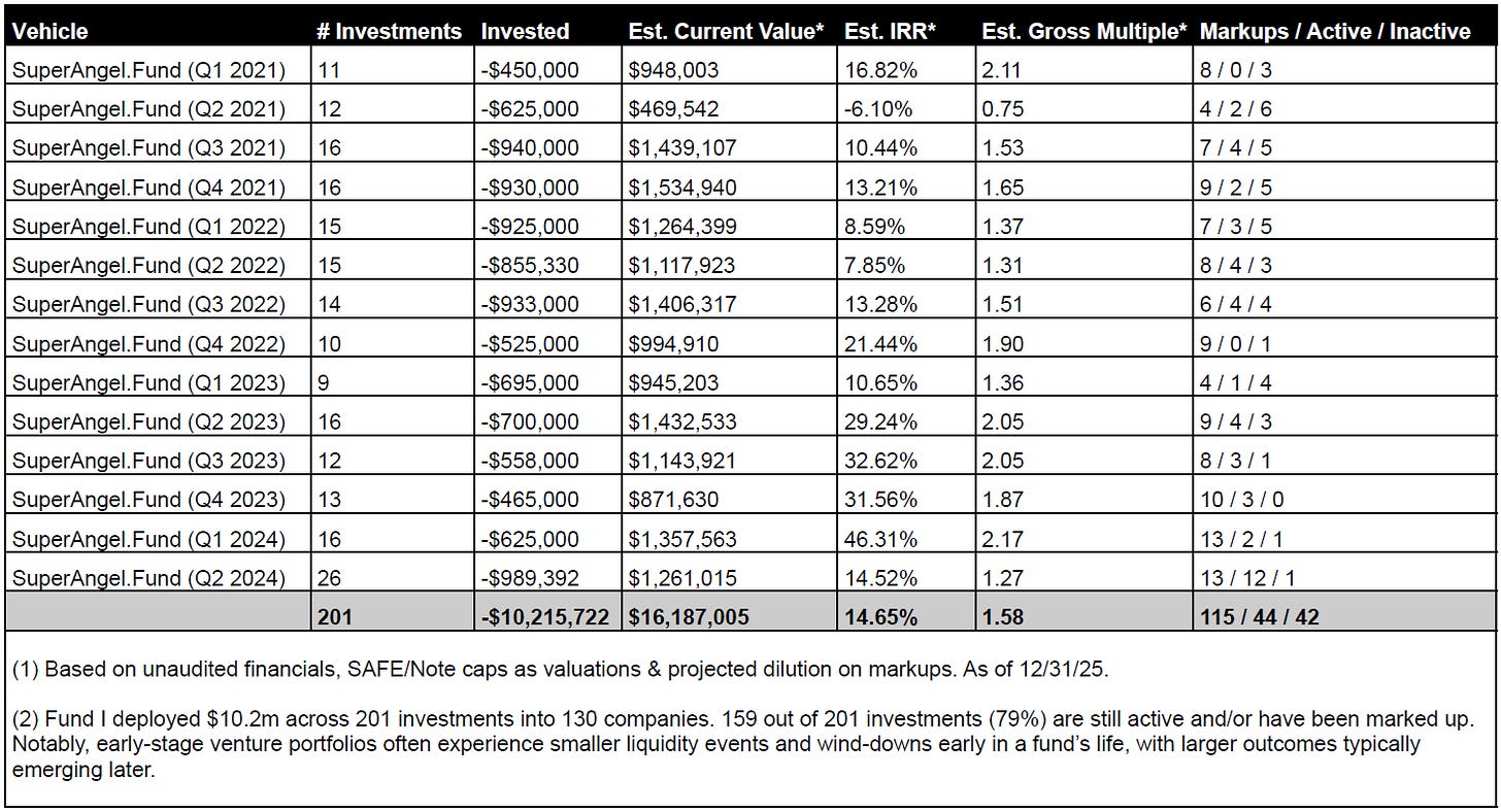 Iβm pleased to share SuperAngel.Fundβs Q4 2025 update, covering Fund I (our 2021-2024 rolling fund) as well as our newly active Fund II.